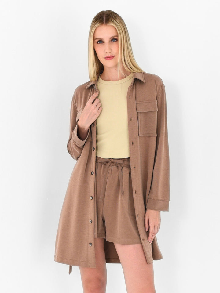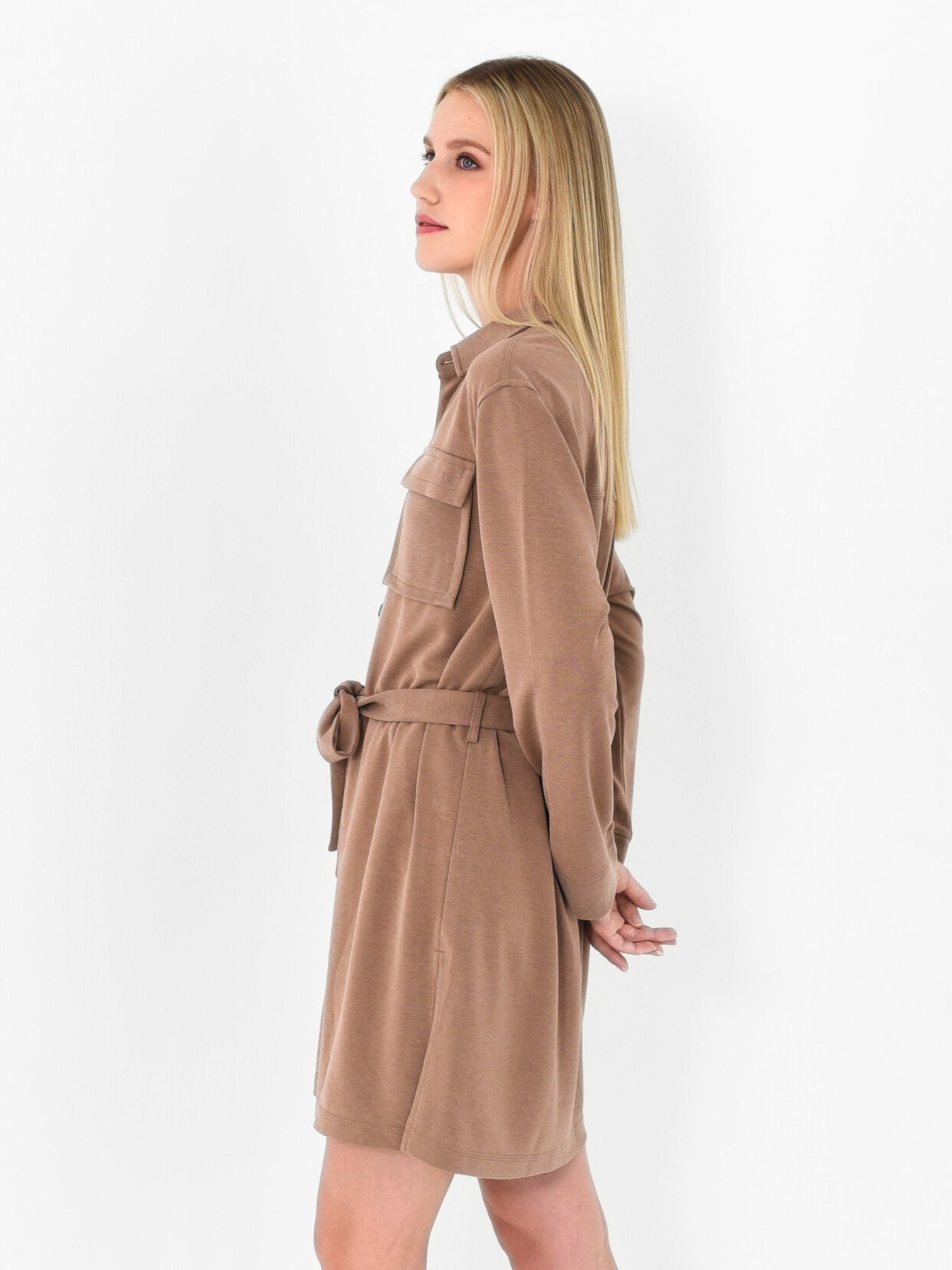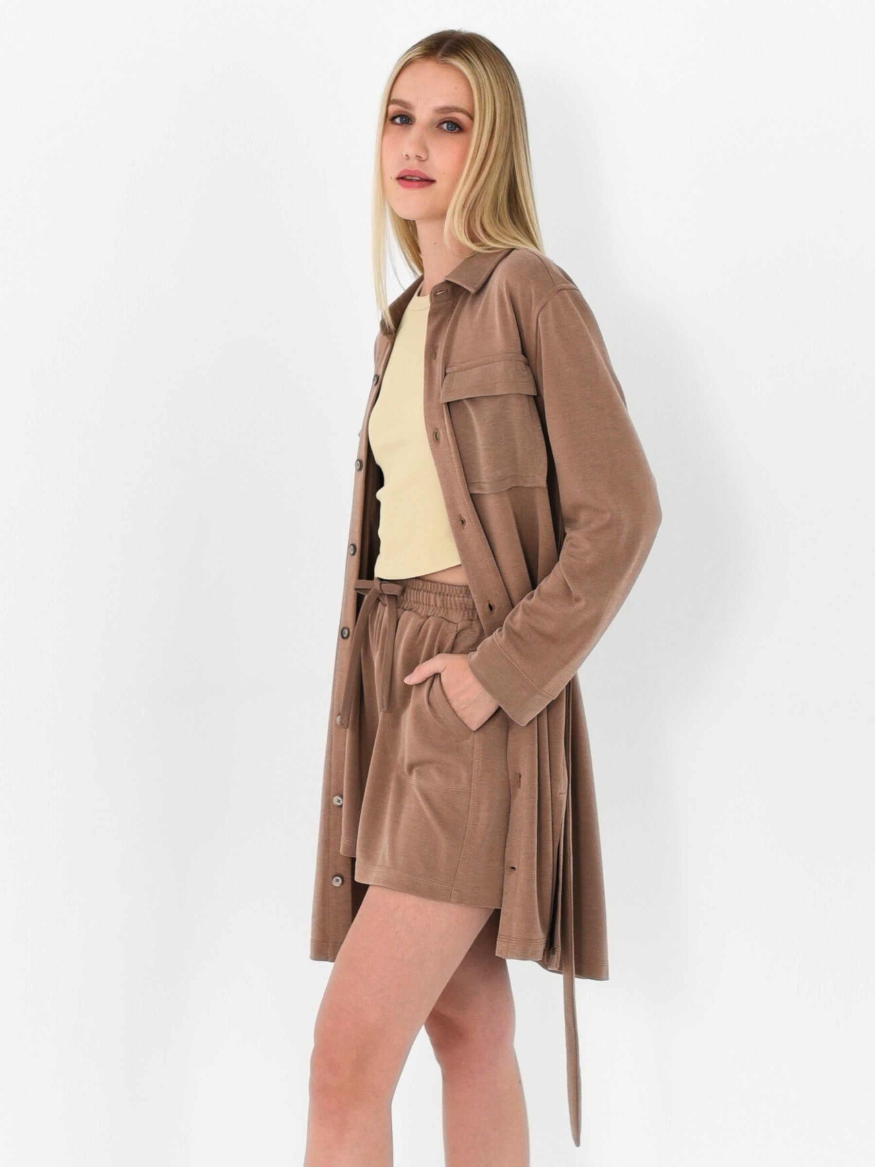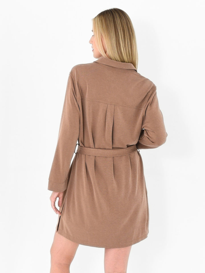 A modern shirt tunic made in our signature TENCEL™ knit with clean lines and functional details. Comes with a self fabric sash with utility pockets updated for total comfort and command style.