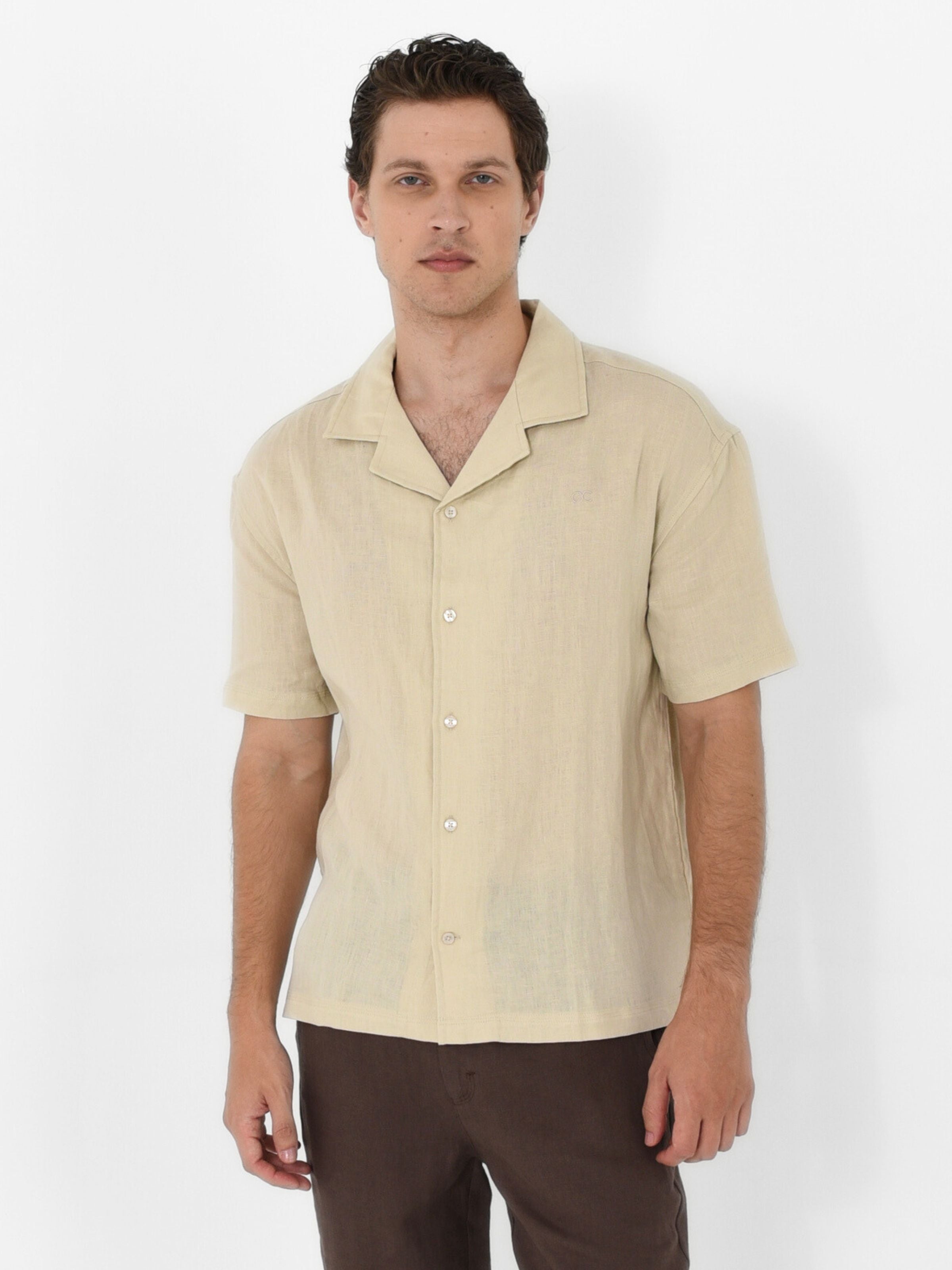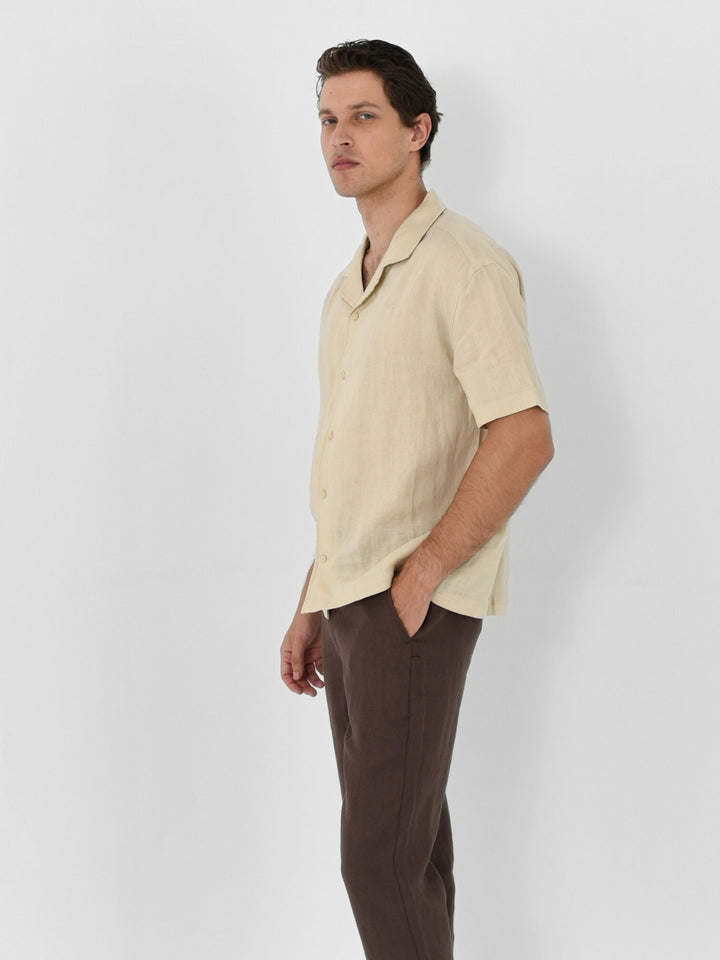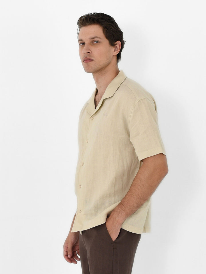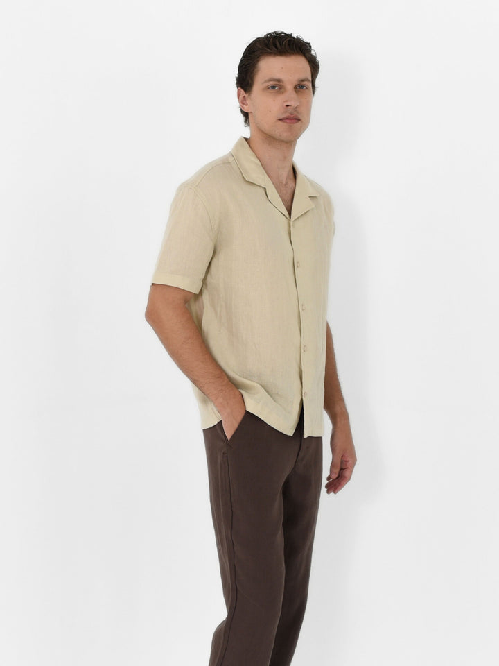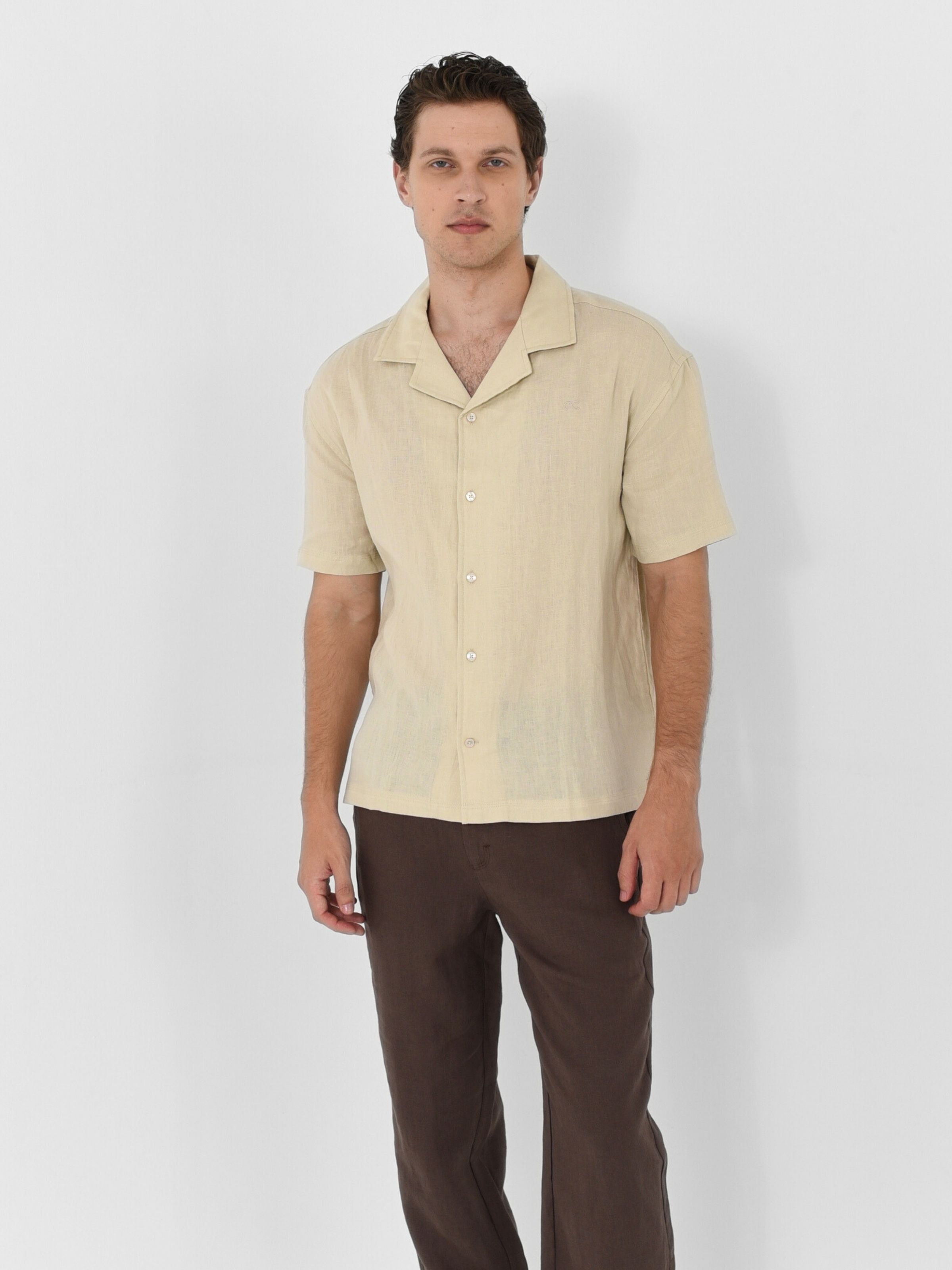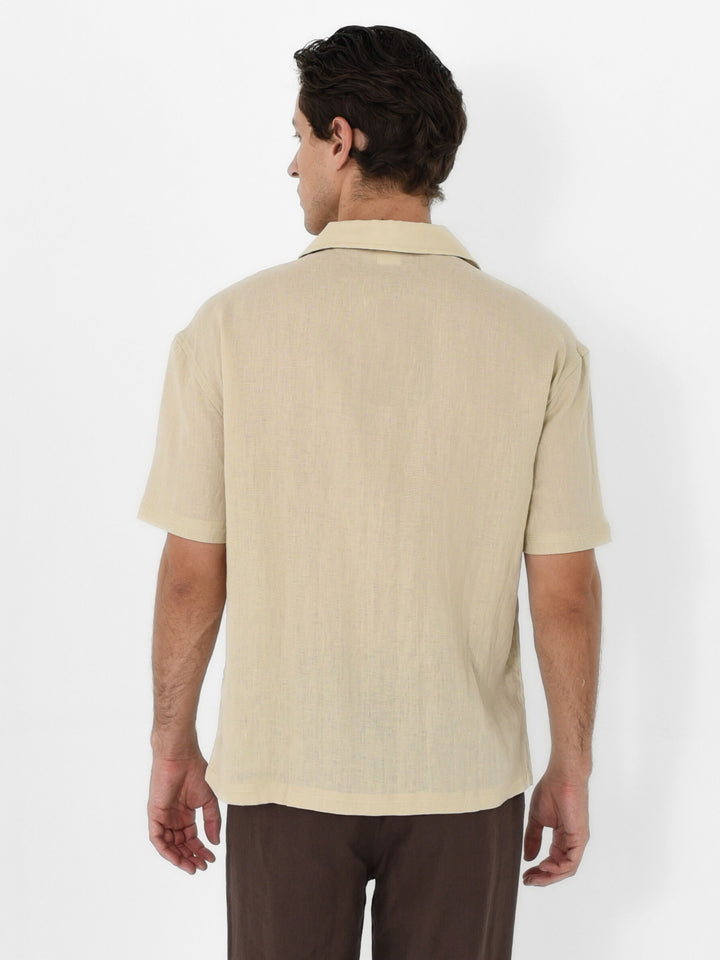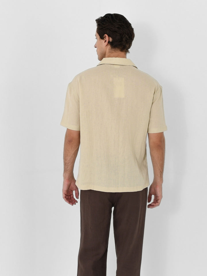Relaxed silhouette with an open Hawaiian collar. It’s a modern take on vacation energy, made to move from poolside to post-sunset plans.