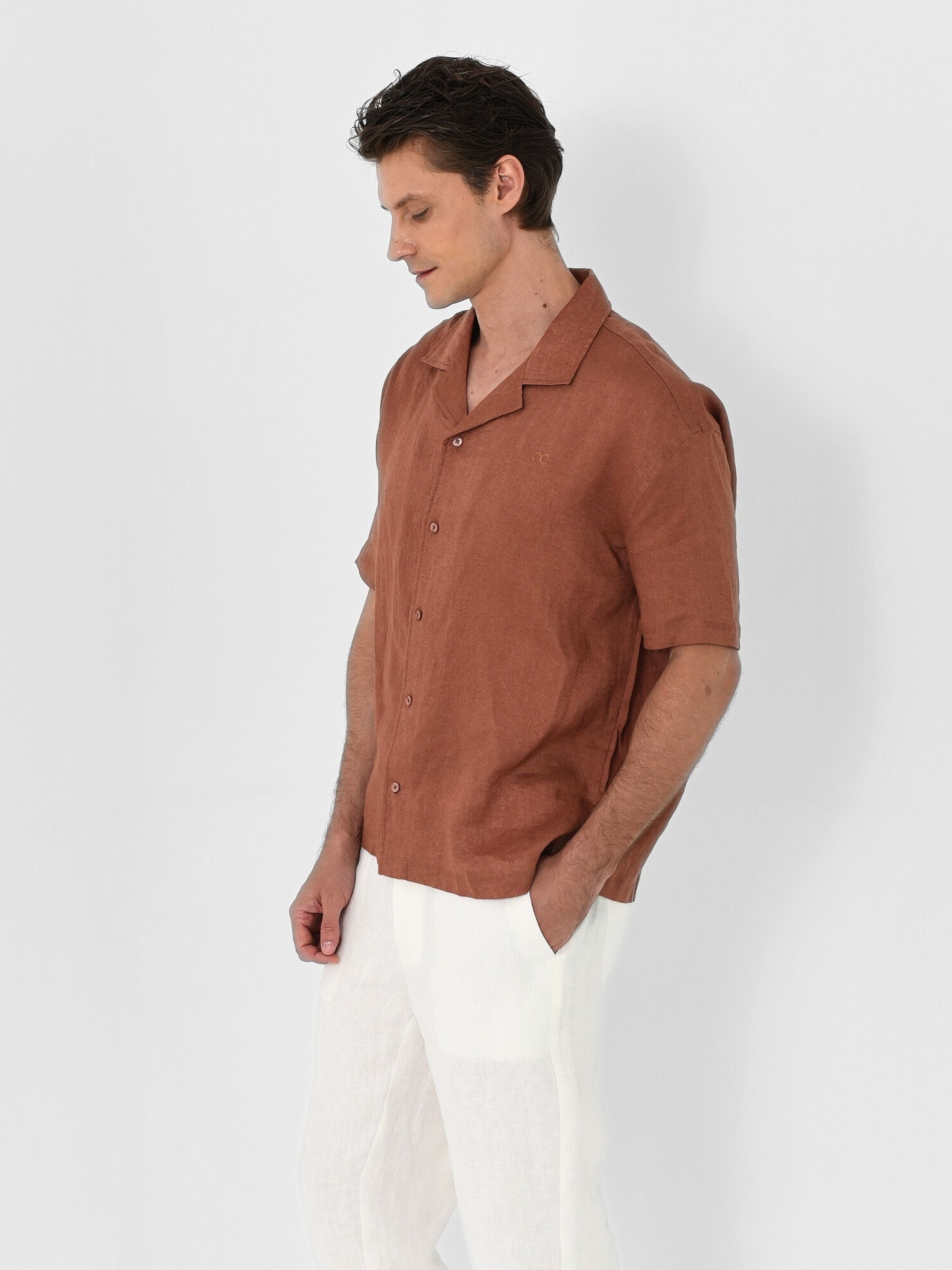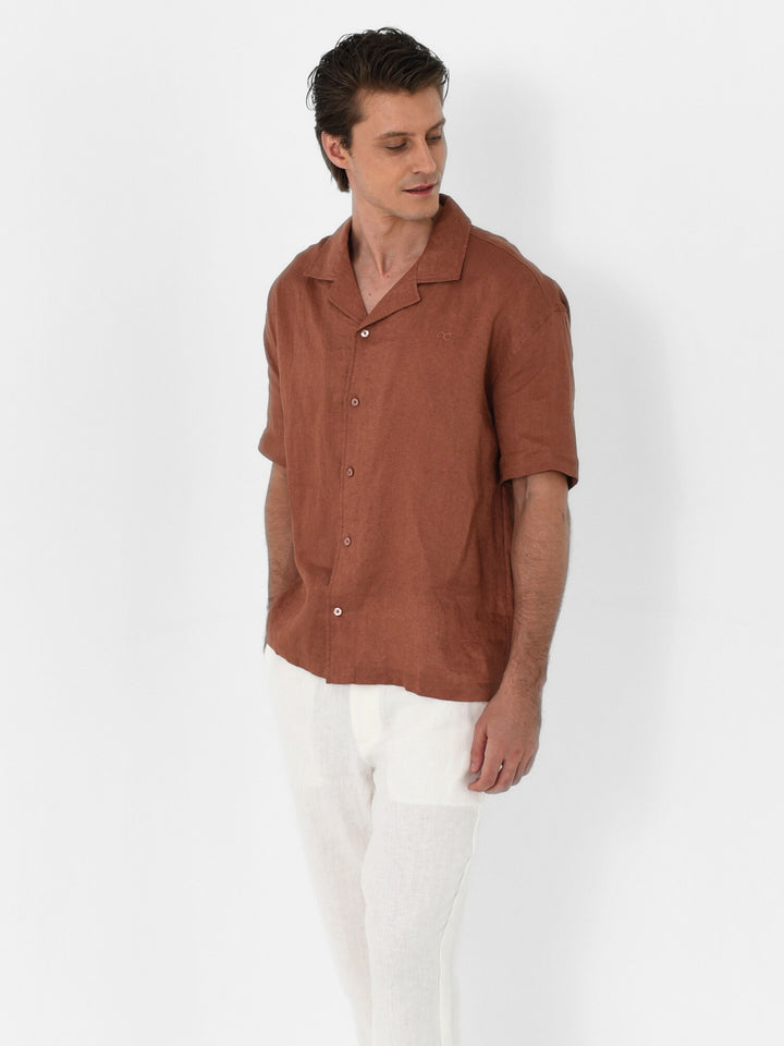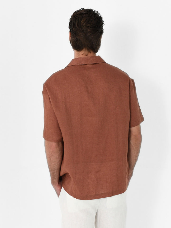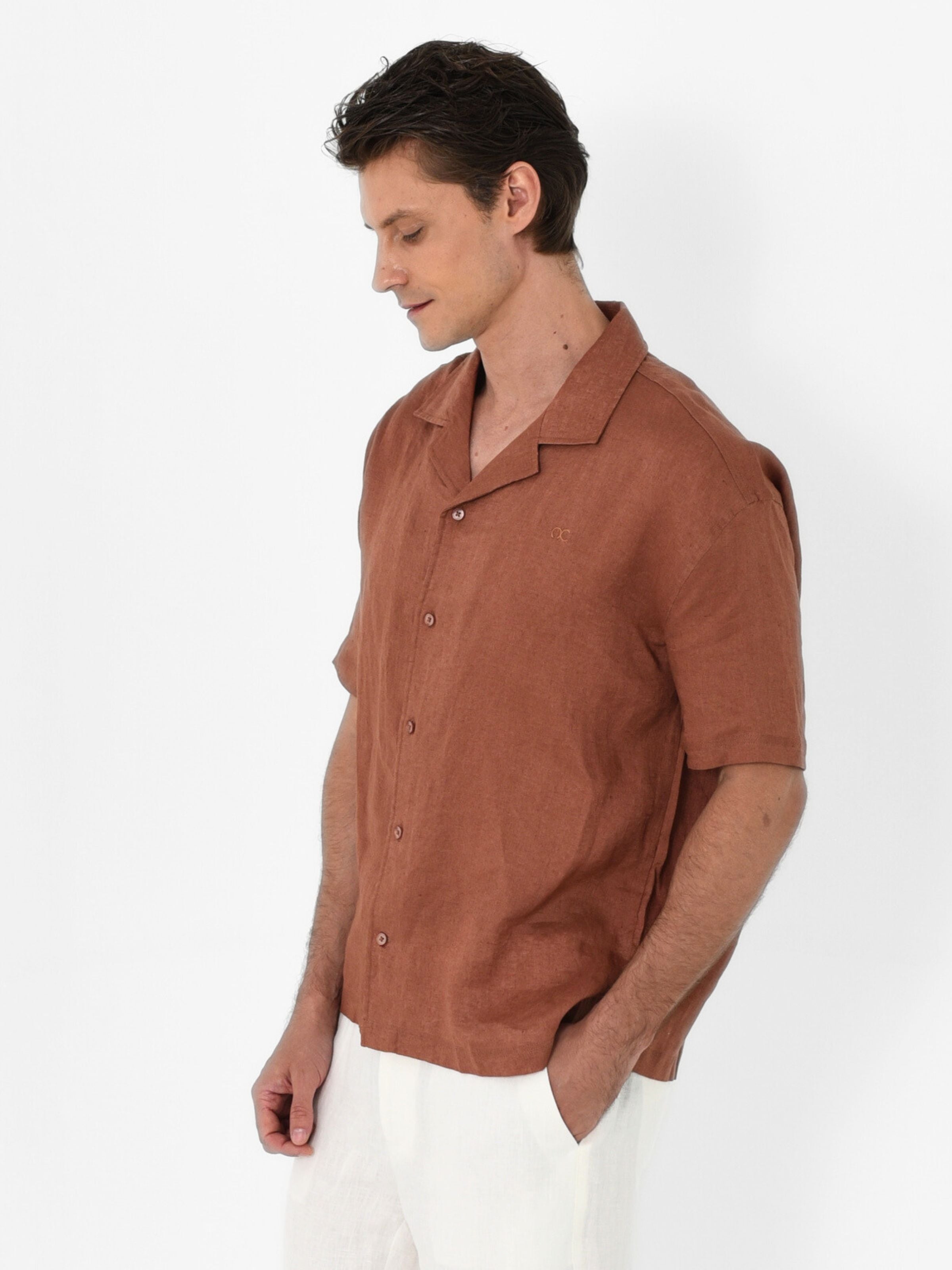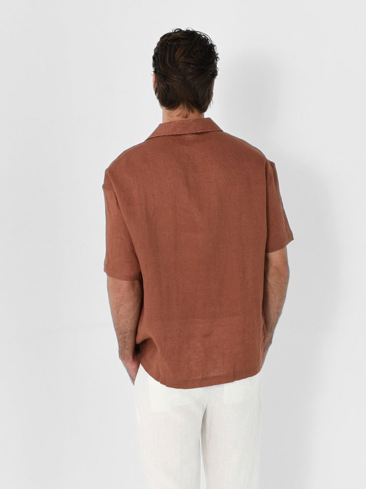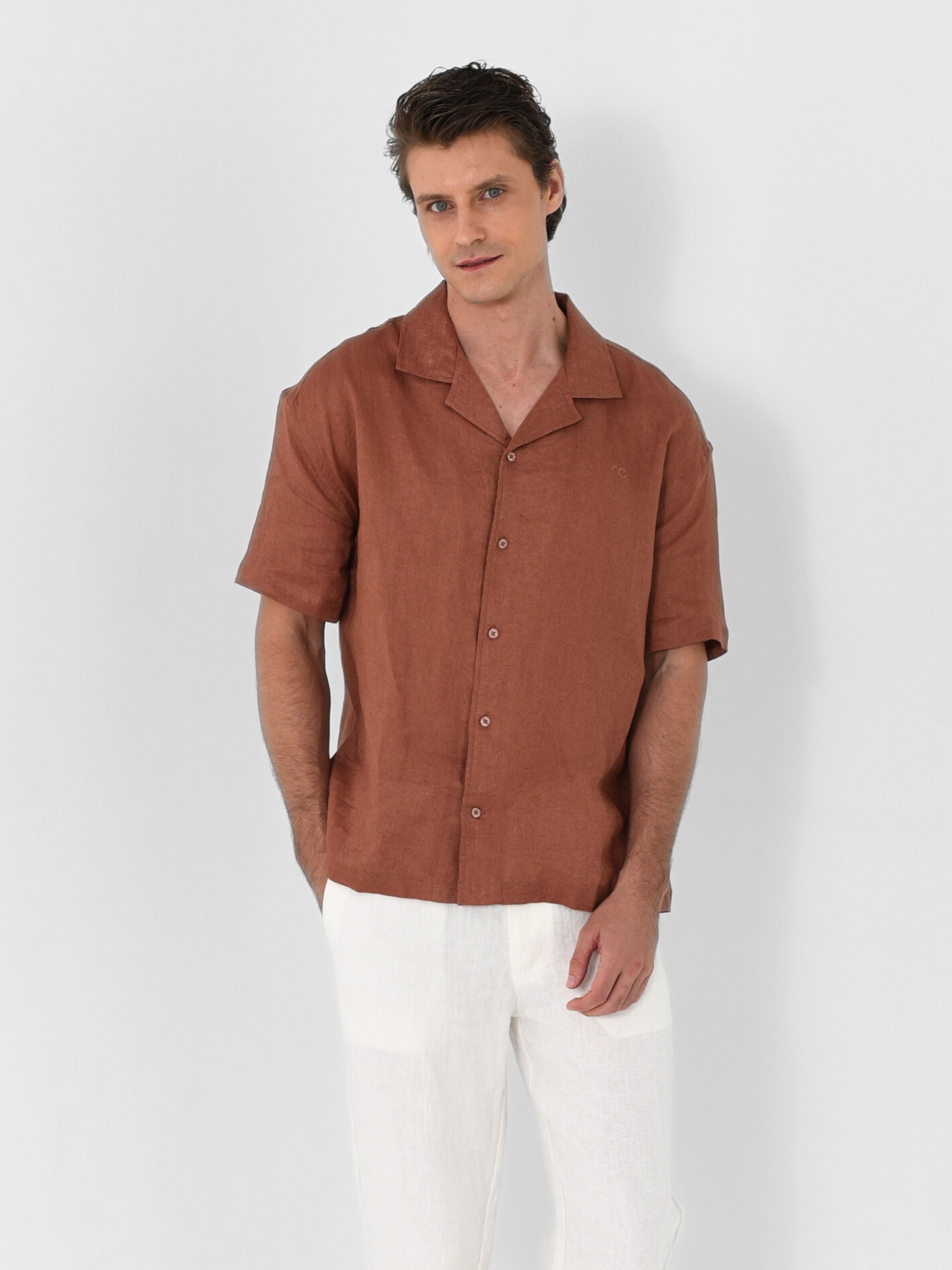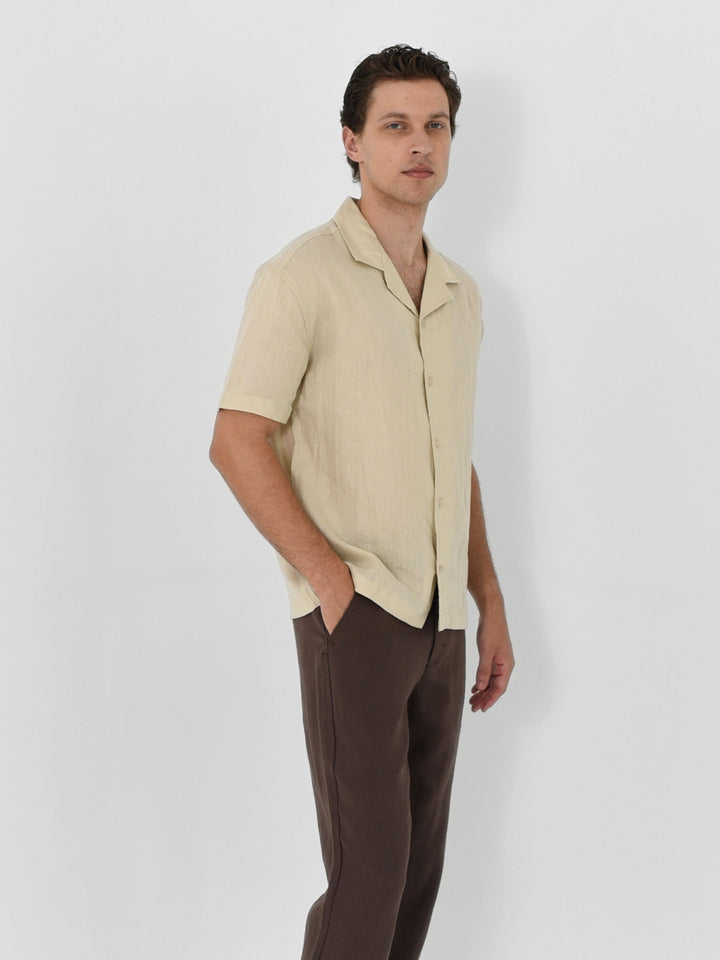Relaxed silhouette with an open Hawaiian collar. It’s a modern take on vacation energy, made to move from poolside to post-sunset plans.