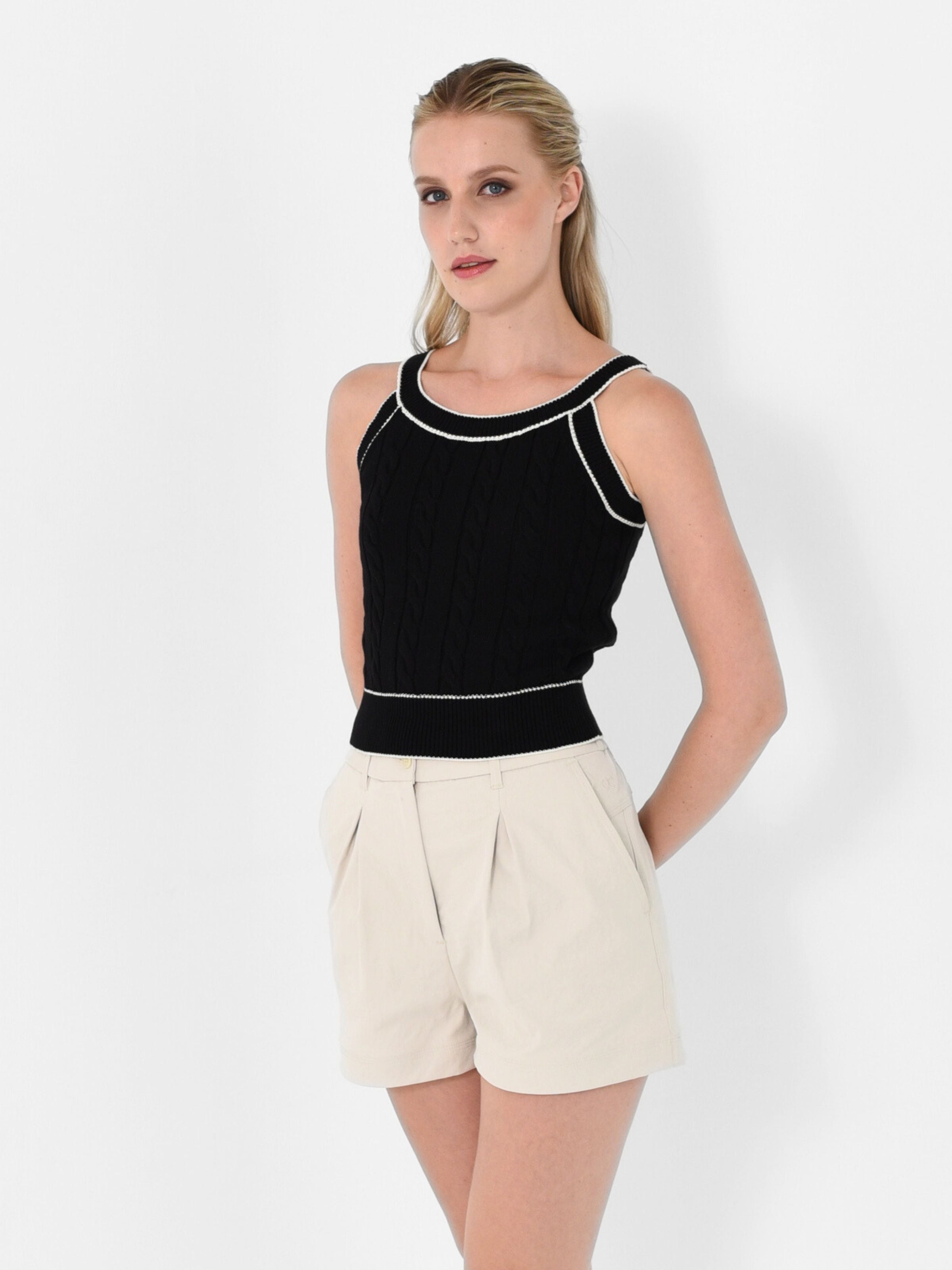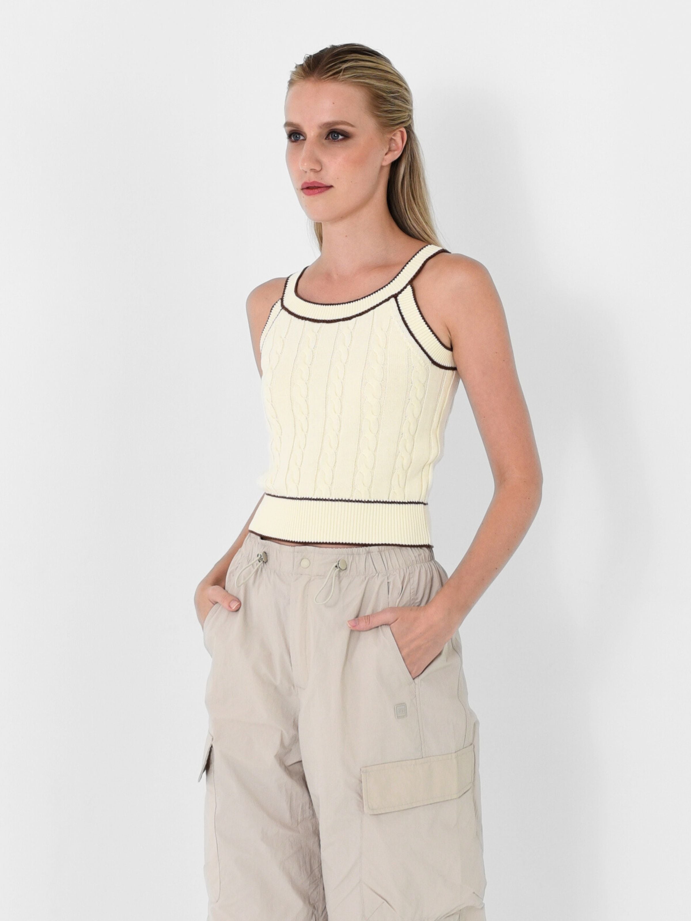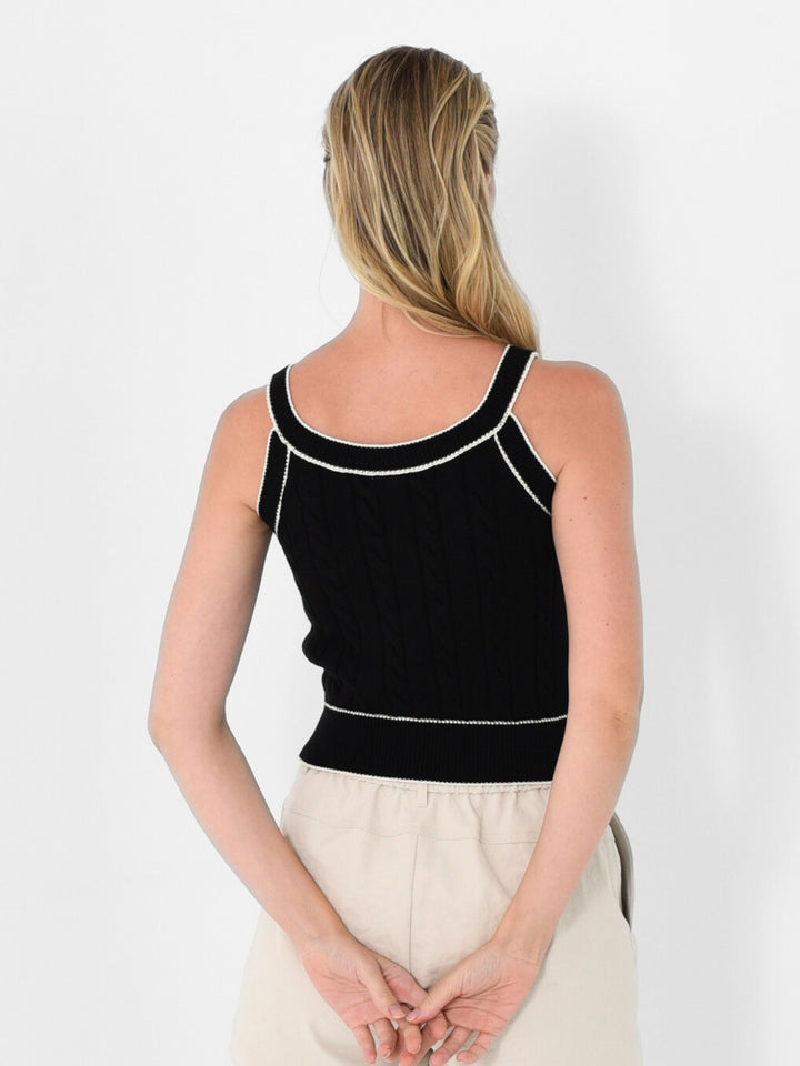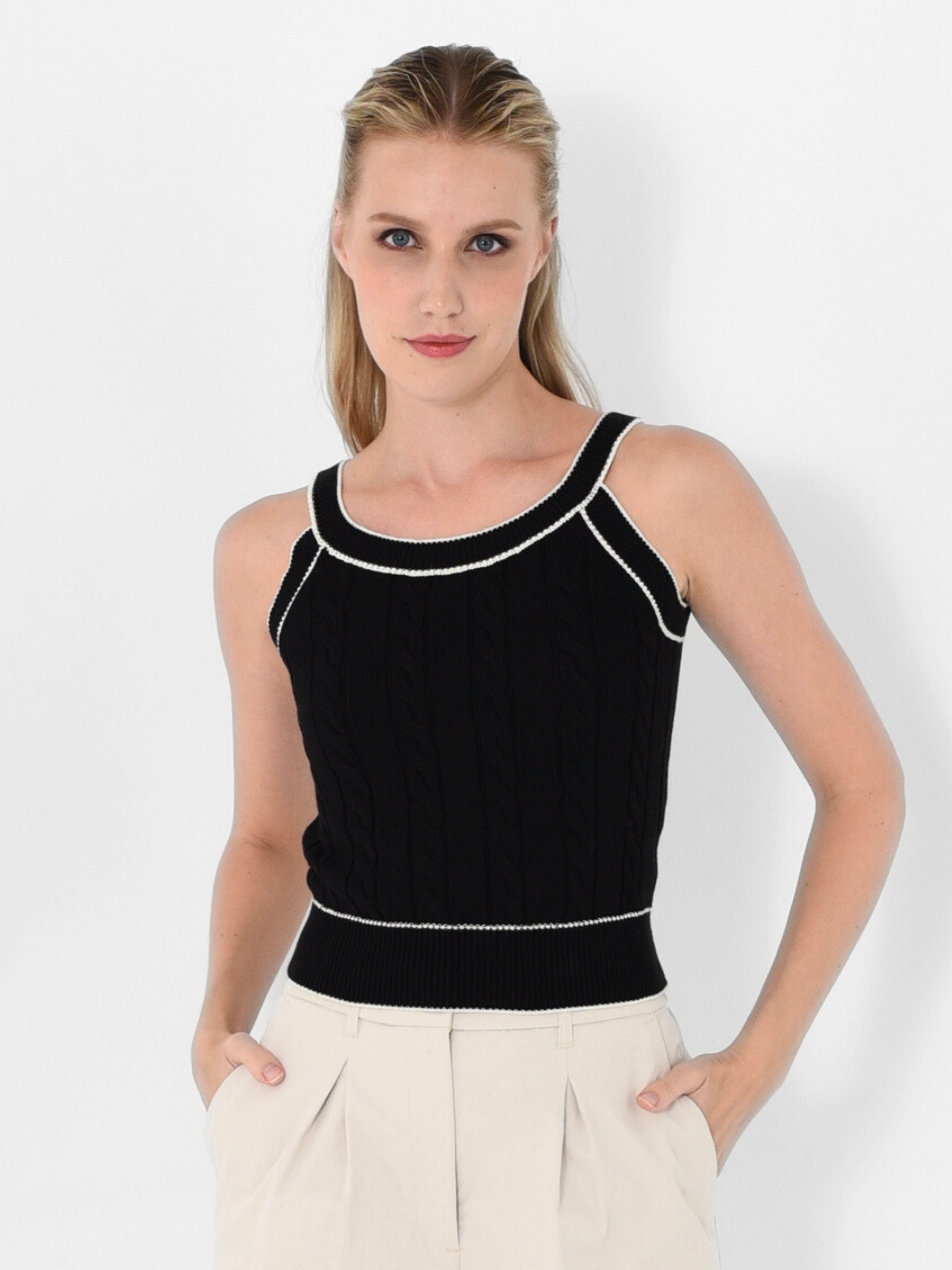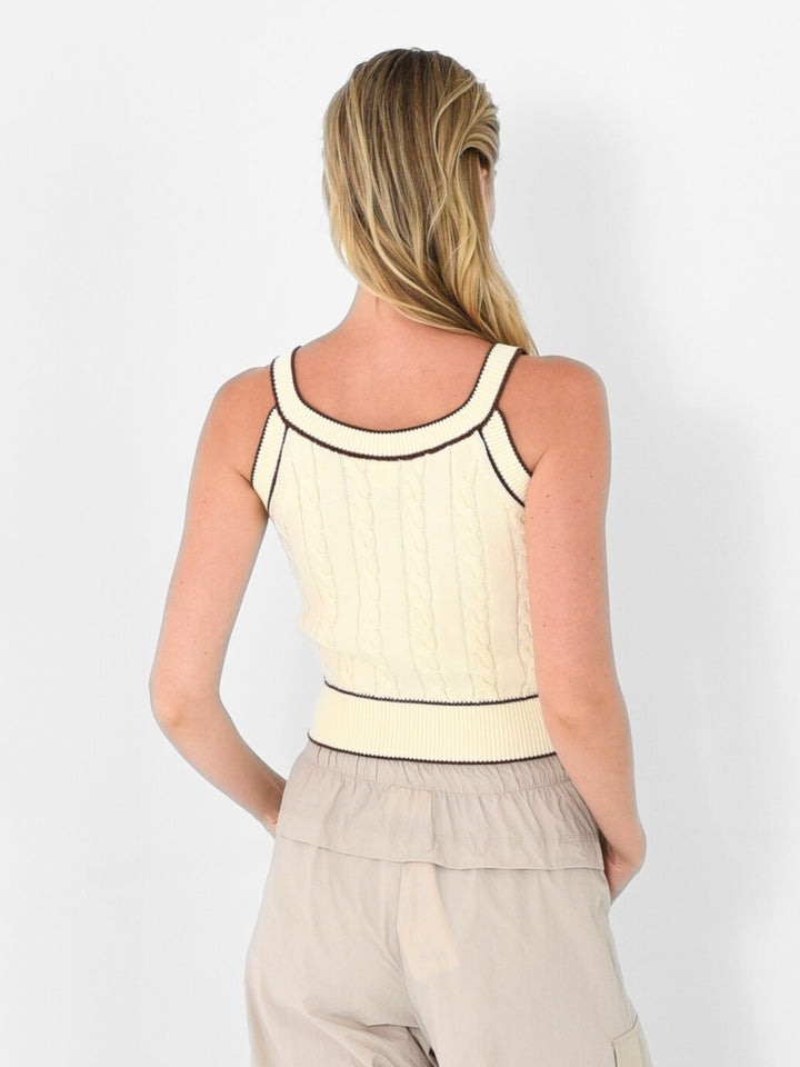 A halter neckline and soft cable knit construction that sculpts gently to the body. Designed for warm days or layered nights.