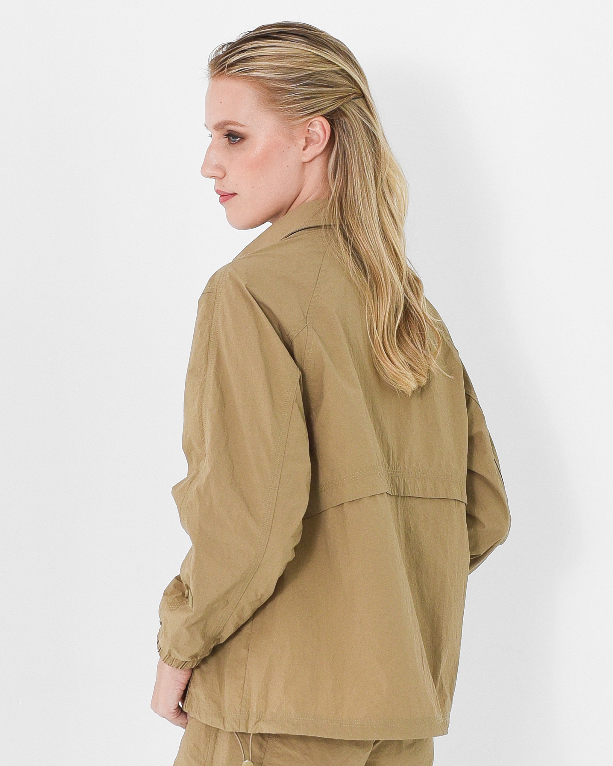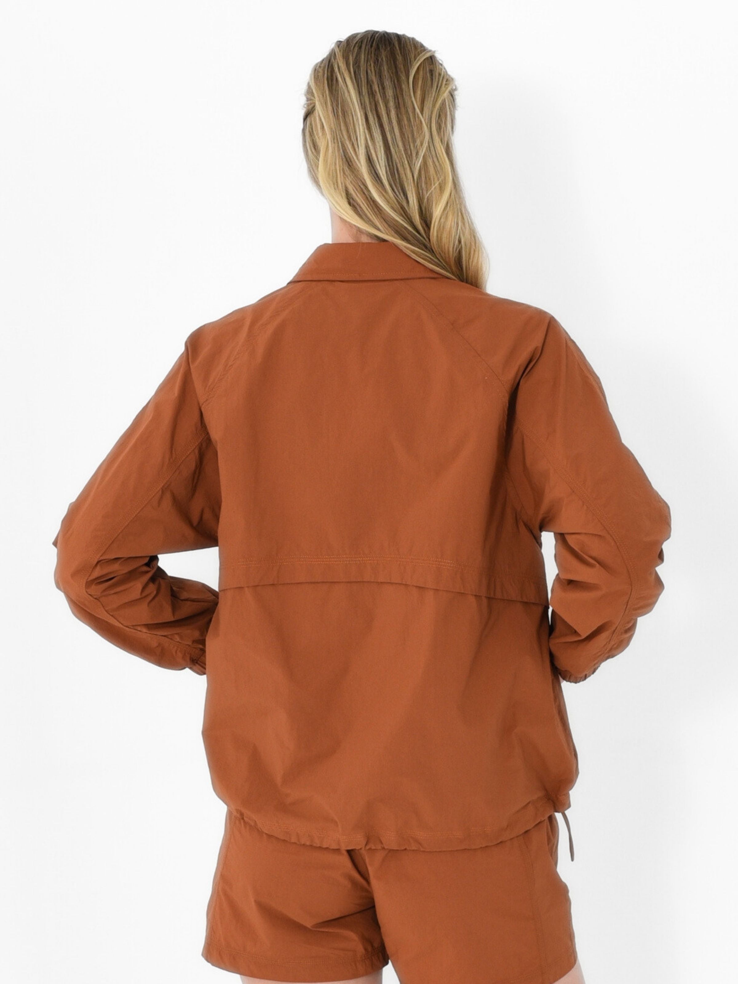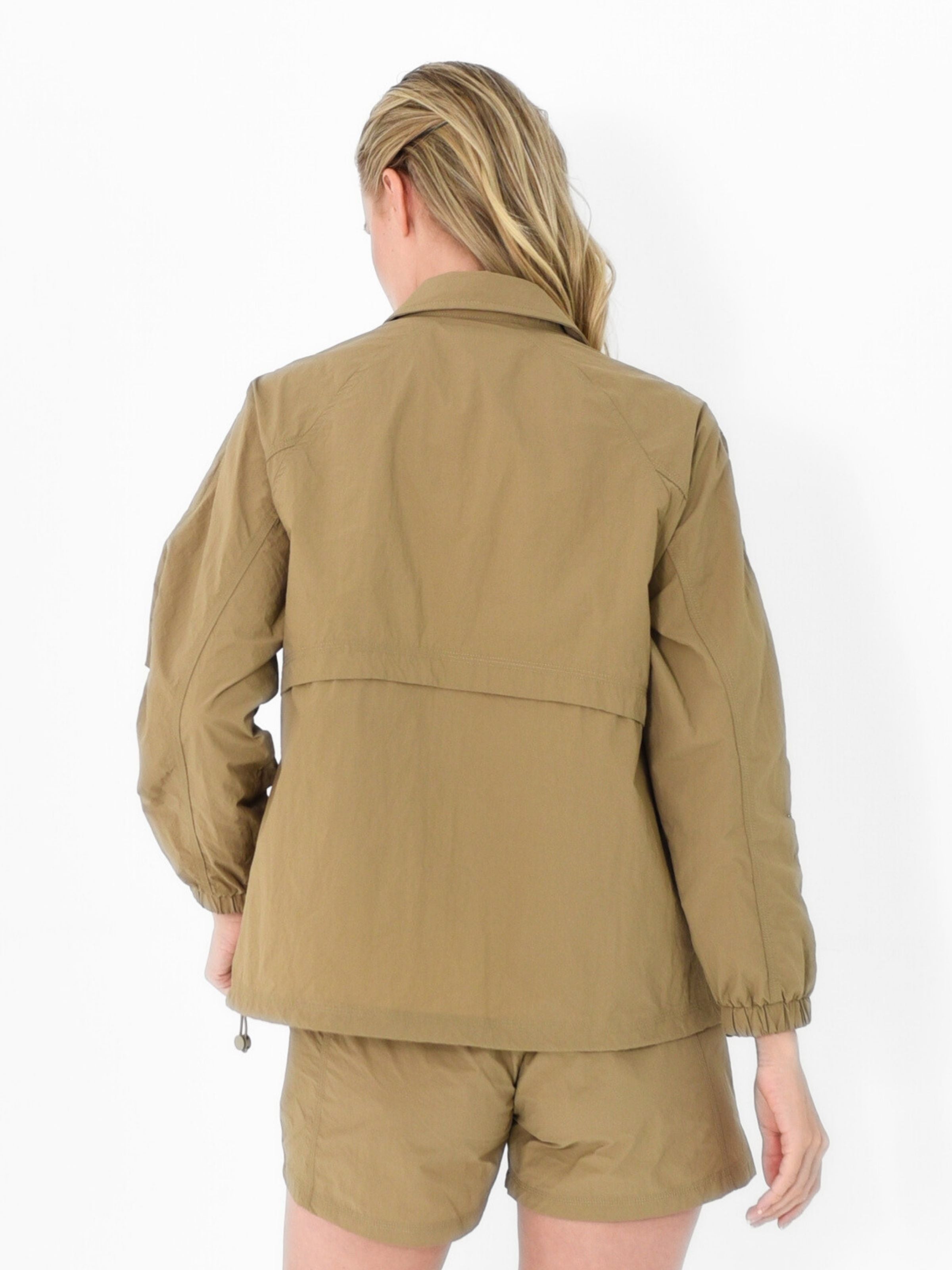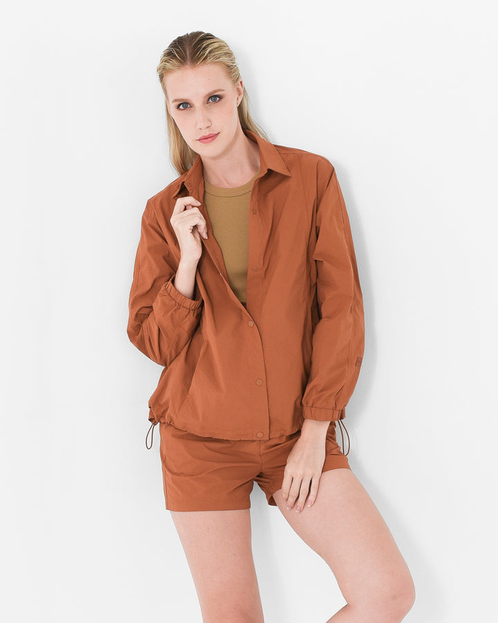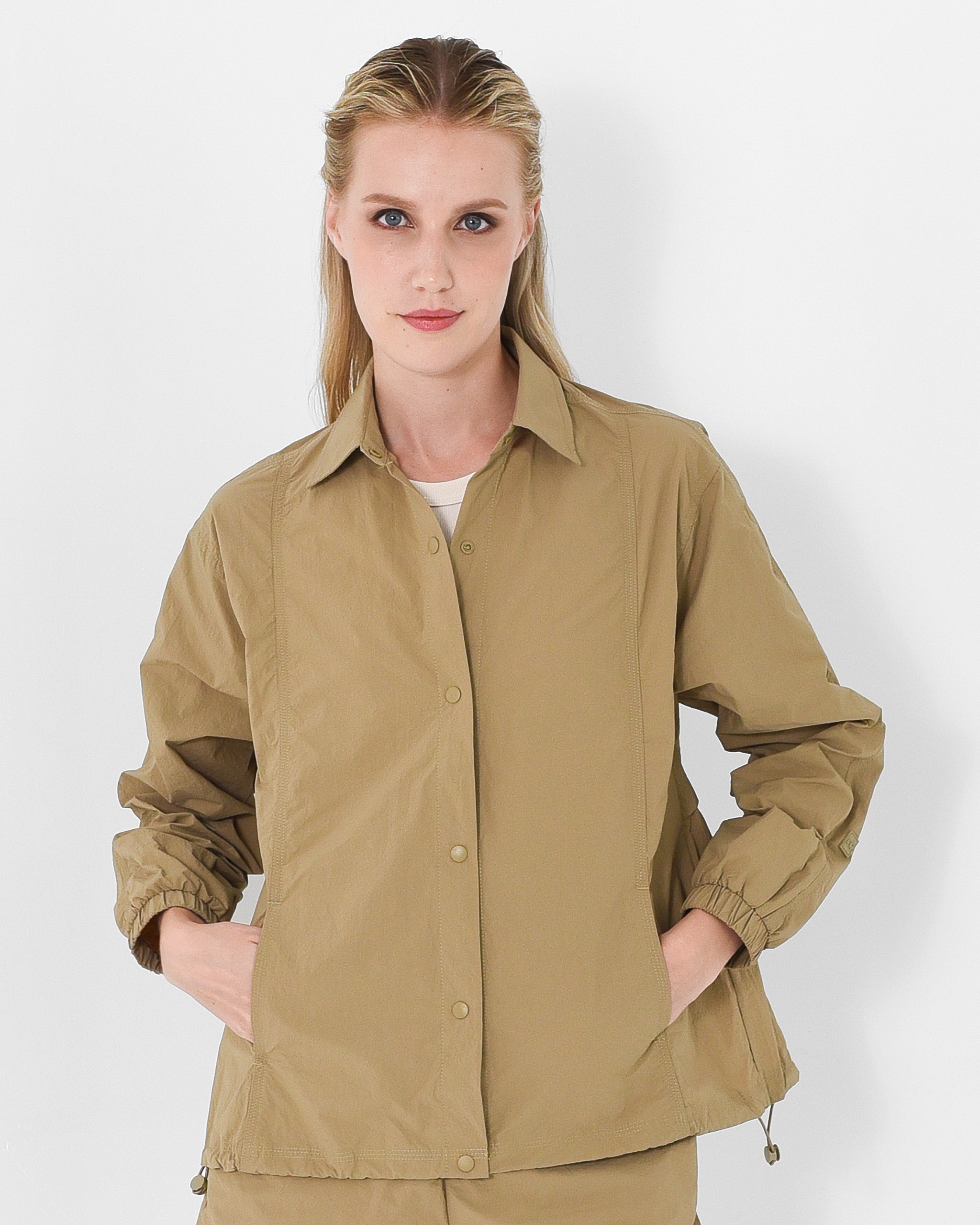 Designed to move with ease, featuring snap-button closure and an adjustable drawstring hem for a personalized silhouette. Perfect for layering or wearing solo.