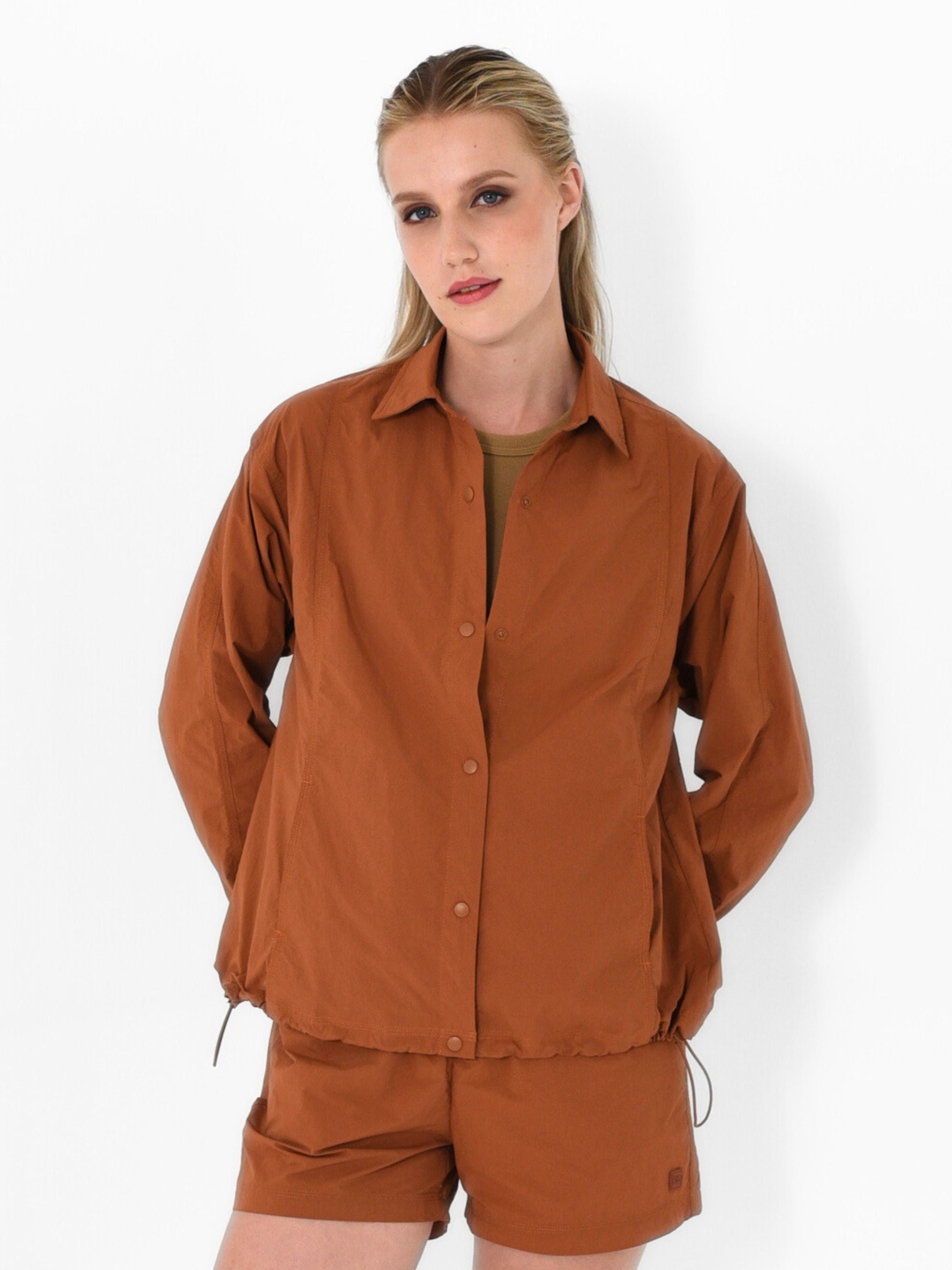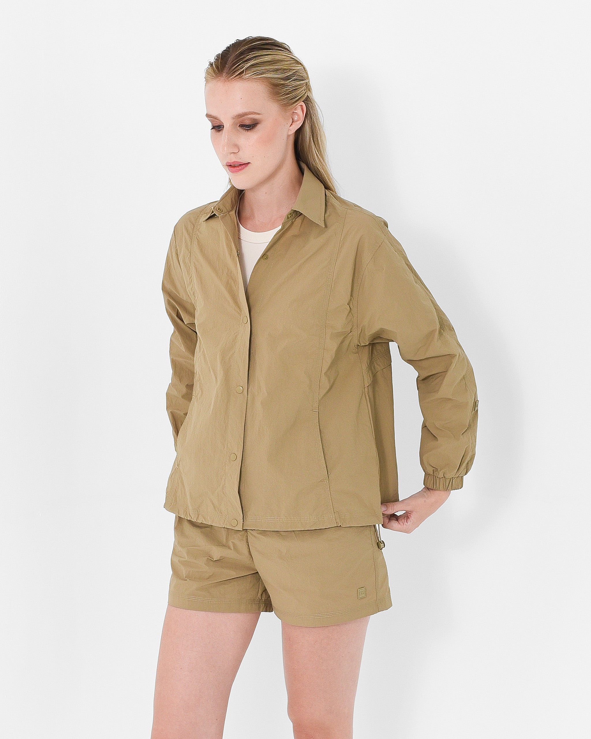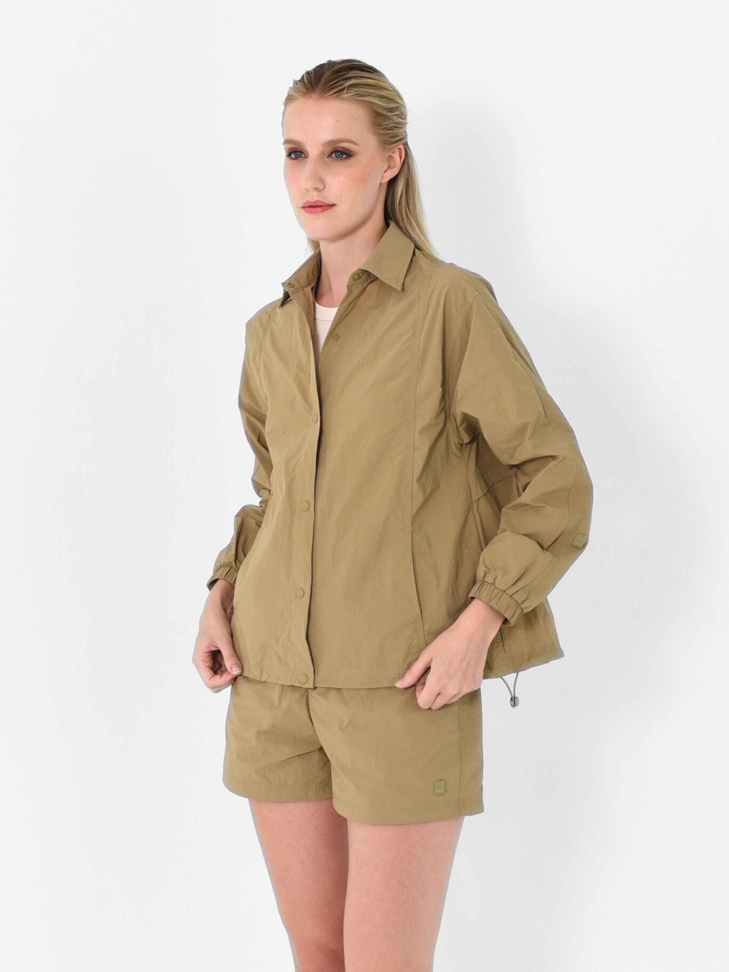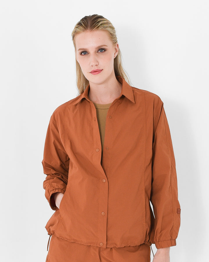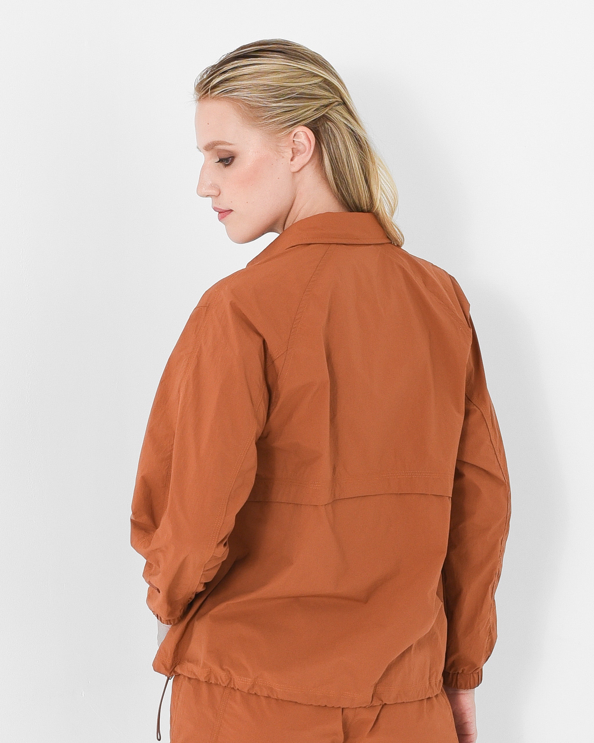 Designed to move with ease, featuring snap-button closure and an adjustable drawstring hem for a personalized silhouette. Perfect for layering or wearing solo.