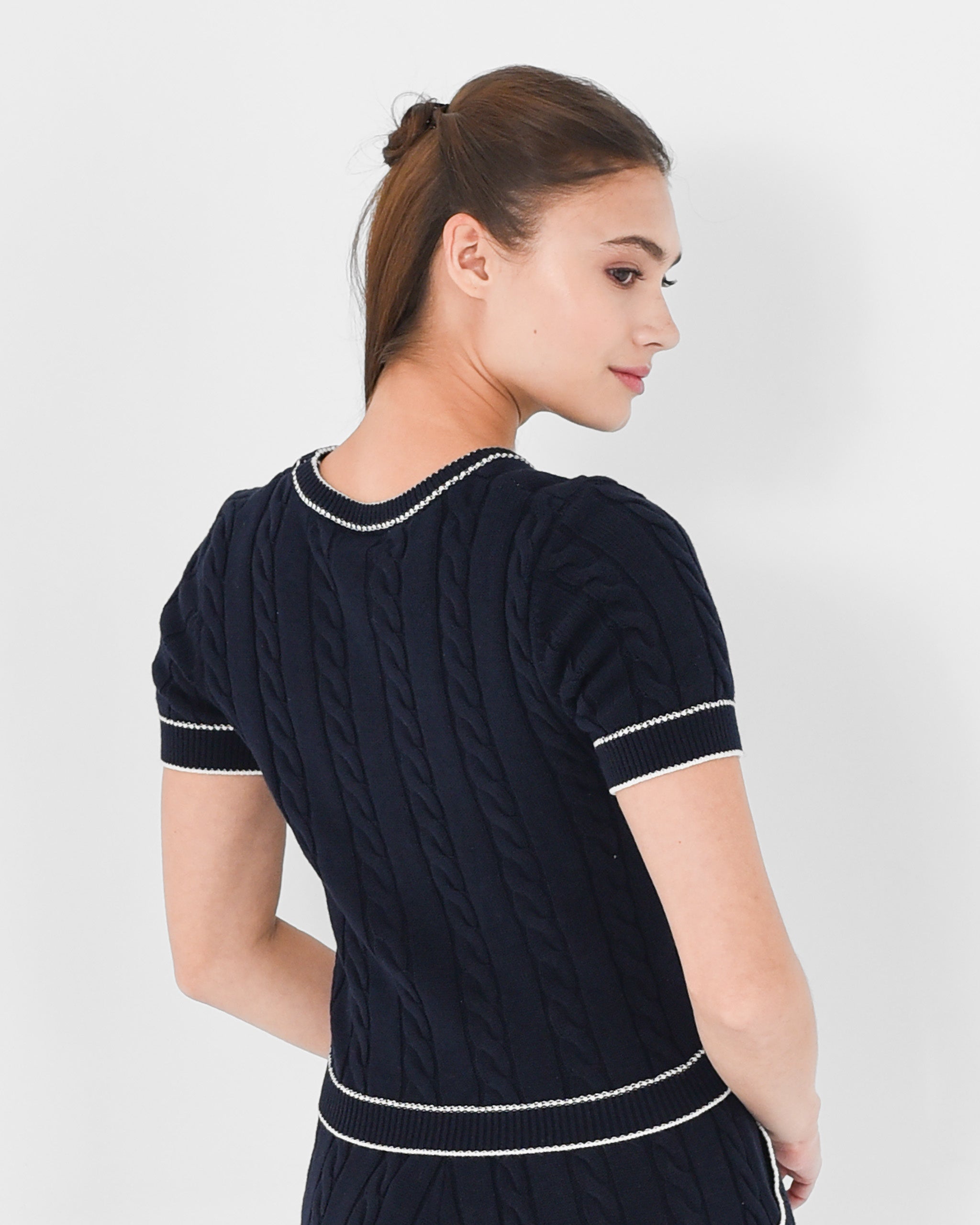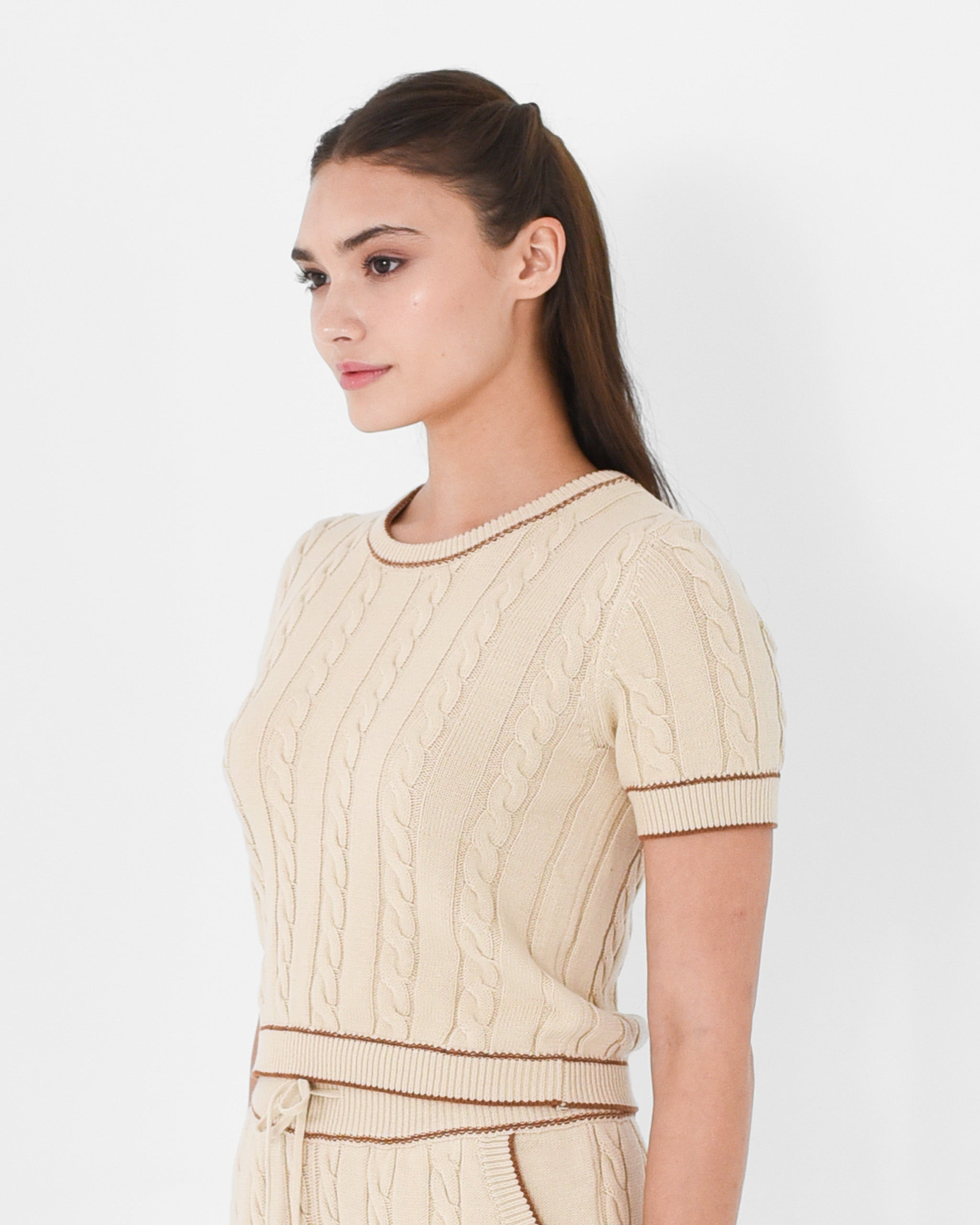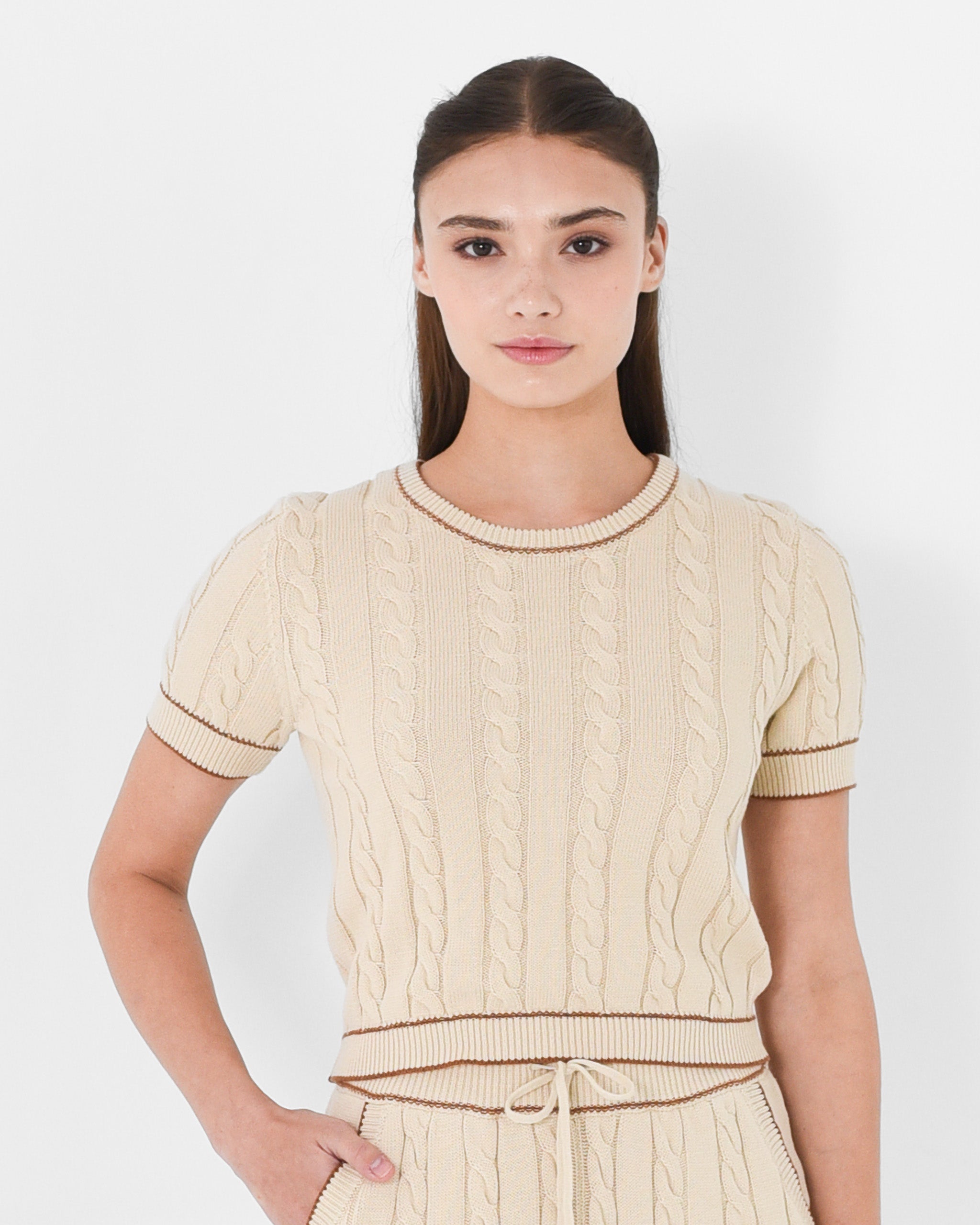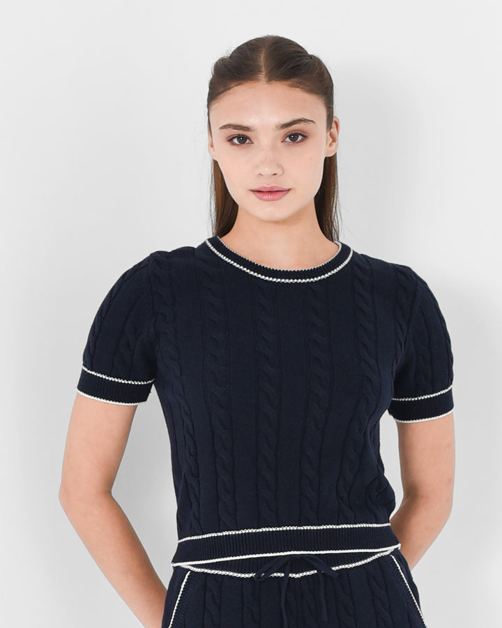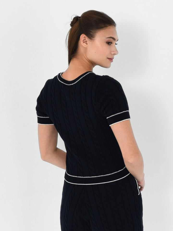 Featuring a timeless cable knit texture with subtle contrast borders along the sleeves and hems that elevates everyday layering with refined simplicity.