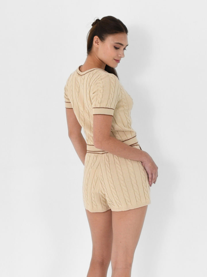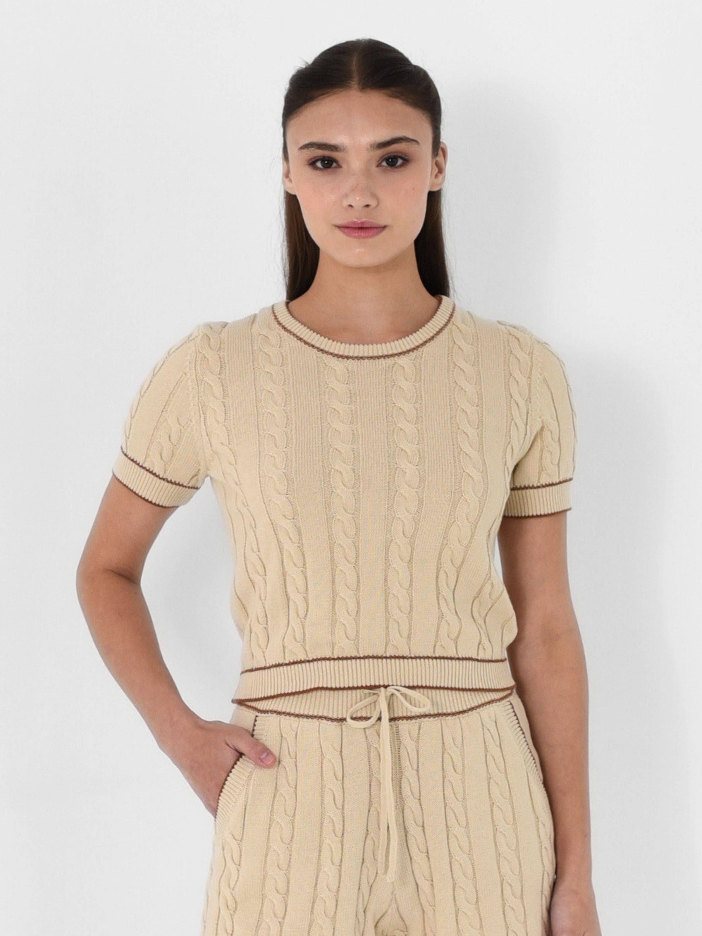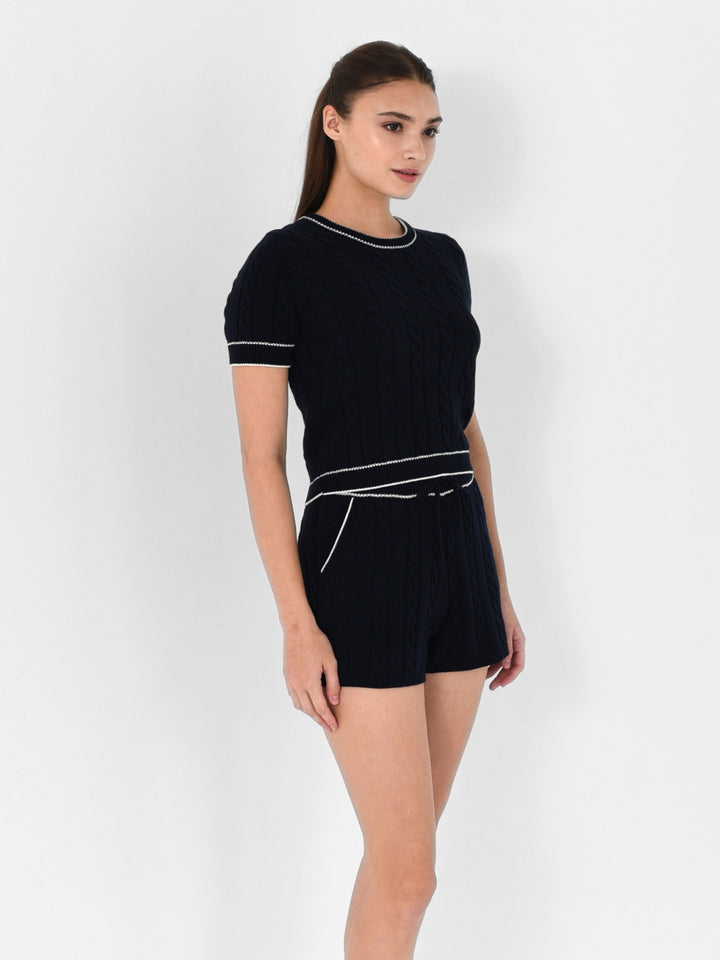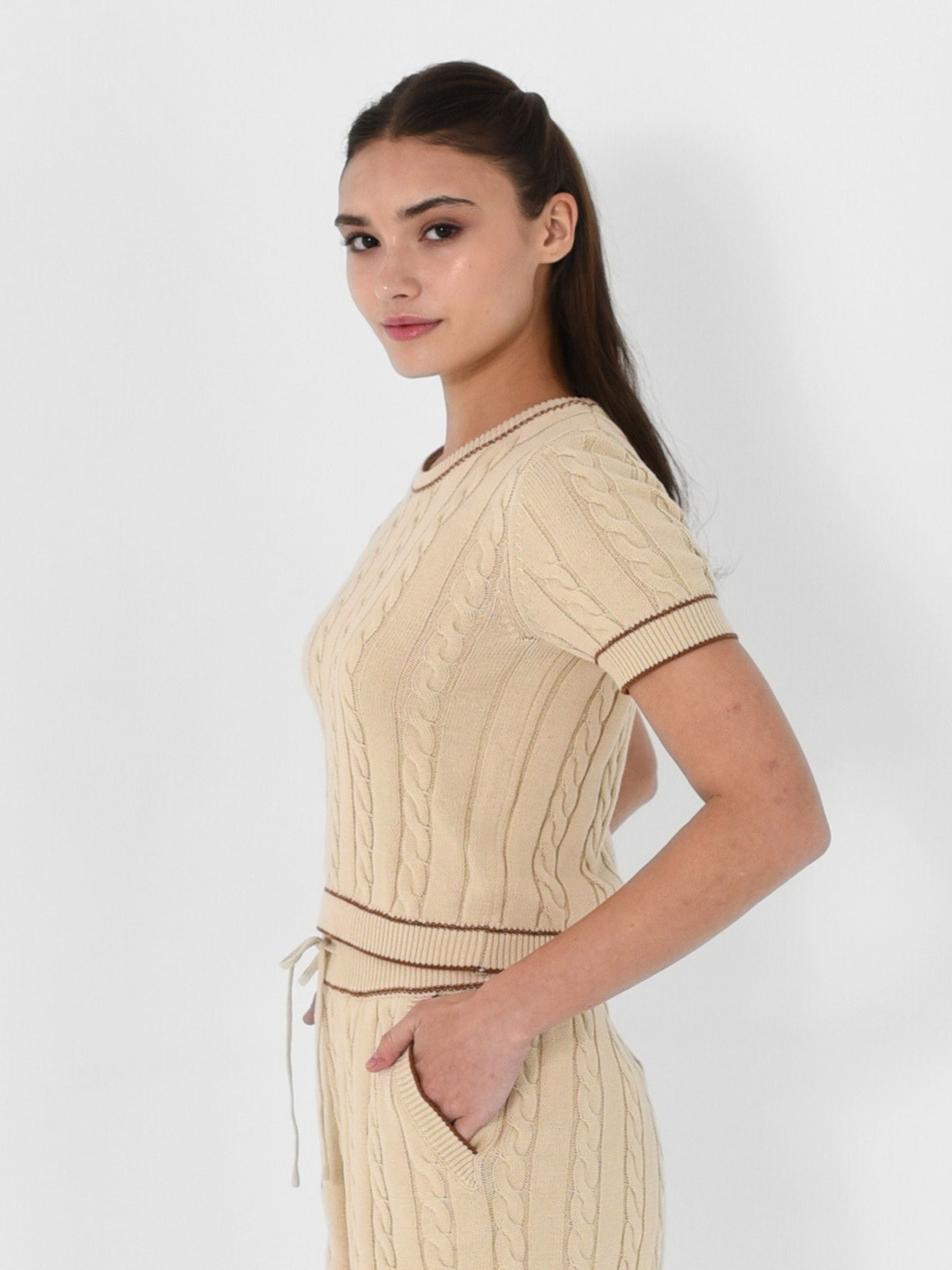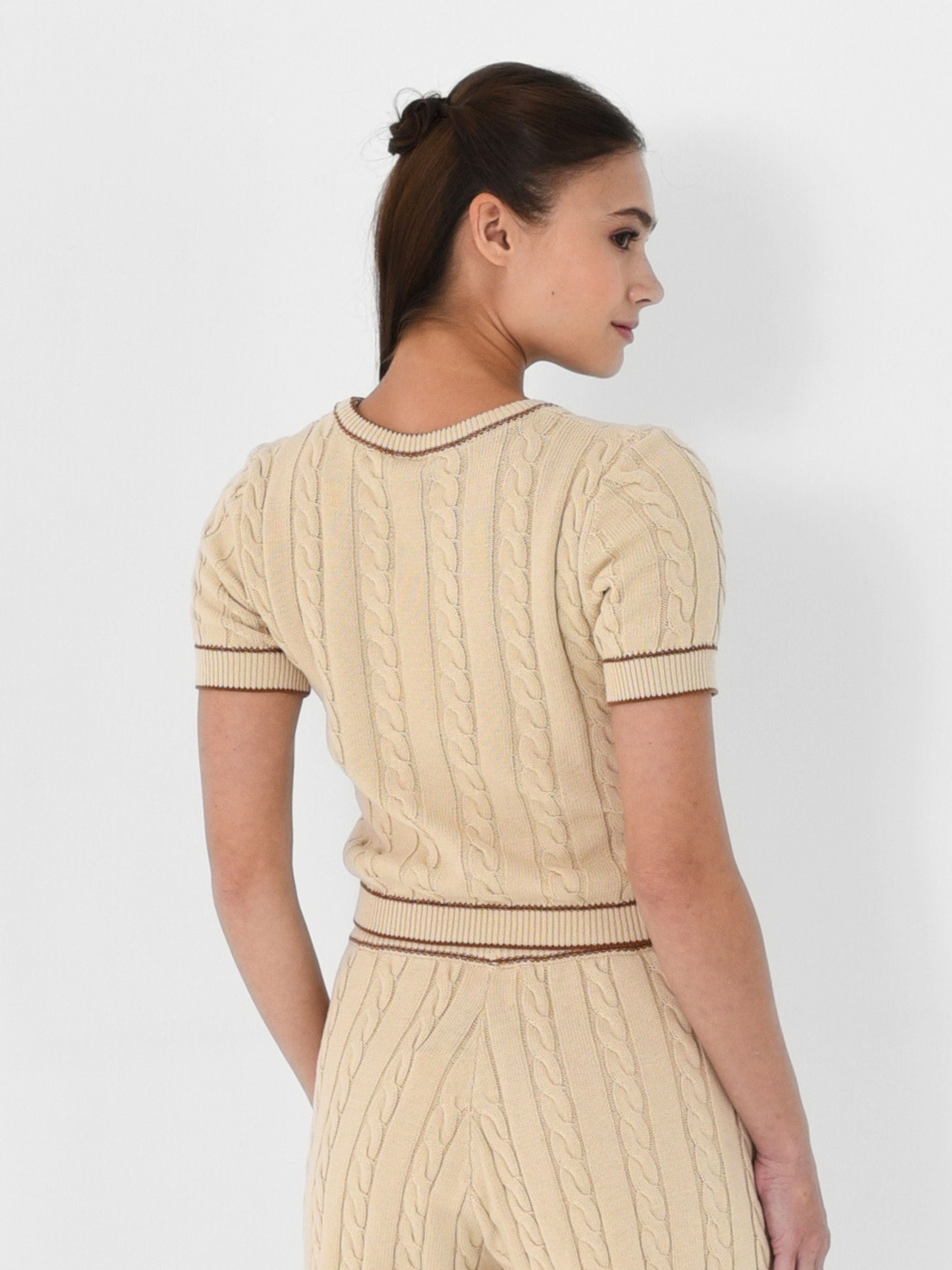Featuring a timeless cable knit texture with subtle contrast borders along the sleeves and hems that elevates everyday layering with refined simplicity.